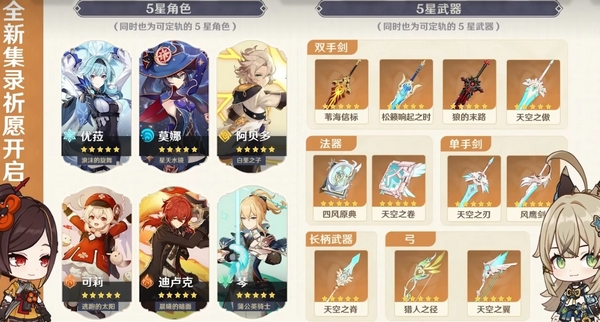 这次可以定轨的5星角色包含优菈、莫娜、阿贝多、可莉、迪卢克,5星武器包含双手剑、单手剑、法器武器等11把。伴随这次混池一同而来的还有5星的限定UP角色“千织”,并复刻荒泷、那维莱特、万叶等角色,此外还会有新的5星单手剑和4星长柄武器。