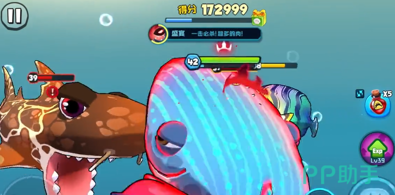 在攻击的时候,大家可以选择使用蓝鲸的【成长】技能,这个技能算是十分无敌的技能了,大家在攻击敌人的时候,可以获得双倍的经验值,当然了,由于蓝鲸的群体特殊性,在游戏中属于中立类的,所以大家在对战过程中,如果遇到不同的鱼类,等级比蓝鲸高的话,都是可以对蓝鲸发起攻击的,这是一个比价大的确定,前期的话,就更加的注重于发育成长了,给大家一个小提示,蓝鲸在加速过程中,是比其他的鱼类要快的,初期就在水底发育等待秘宝刷新就可以了!