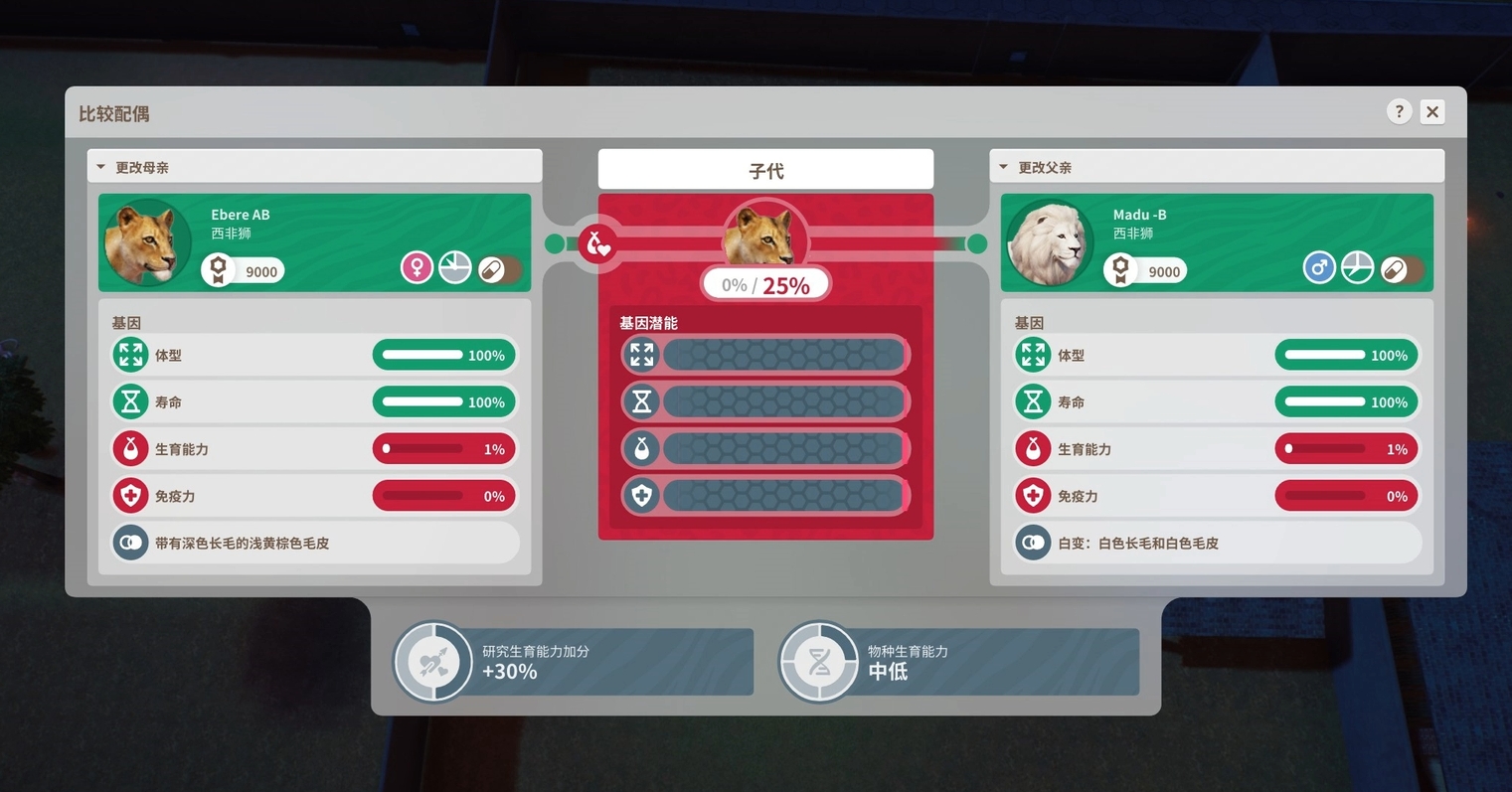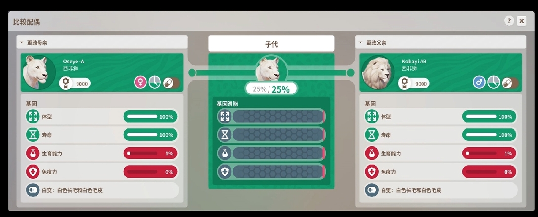 也就是说如果我们想获得一些拥有良好遗传基因的动物,那么我们就需要将双方父母的基因水平都拉高一点。比如说以白化狮子为例,要想后期稳定产出白化狮子的话,那么就需要两只白的进行繁衍。