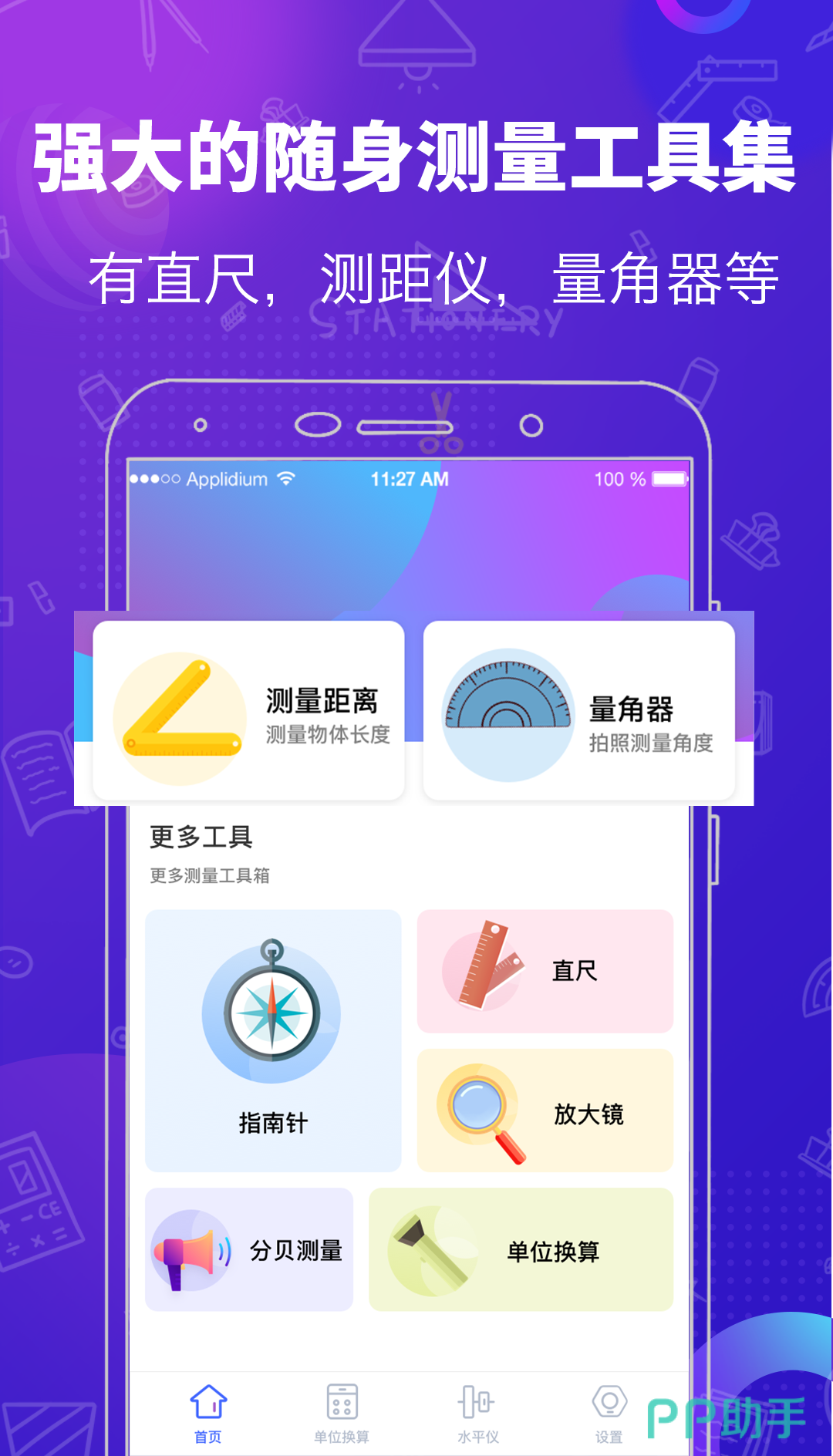 多功能的测量和测距仪,直接可以把测量软件装到口袋里了,再也不用拿各种尺子和工具去测量了,孩子的身高和建筑物的高度等内容均可测量,分贝测量和角度测量也支持。