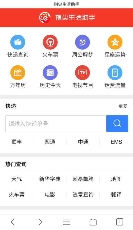 还兼具快递查询、火车票购买、电视节目、话费流量、违章查询等功能。