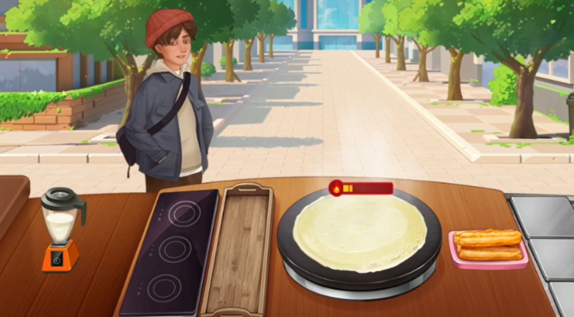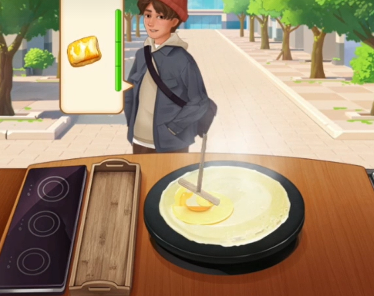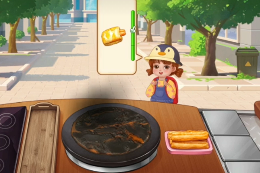 这也算是一个教学的关卡。我们现在可以做的早餐只有手抓饼,我们需要制作两个手抓饼给这位小客人。在制作的时候我们需要记住食物是有着火候条的,在火候条满了之后食物便会烤焦,所以我们需要在食物焦了之前去完成下一步,直到将手抓饼完全做好。在教学关卡之后我们便开始了正式的运营,这个时候游戏会提醒玩家早餐的高峰期即将到来。需要玩家们进行注意。这个时候每经过一位都是我们的顾客,我们不能让他们等太久。