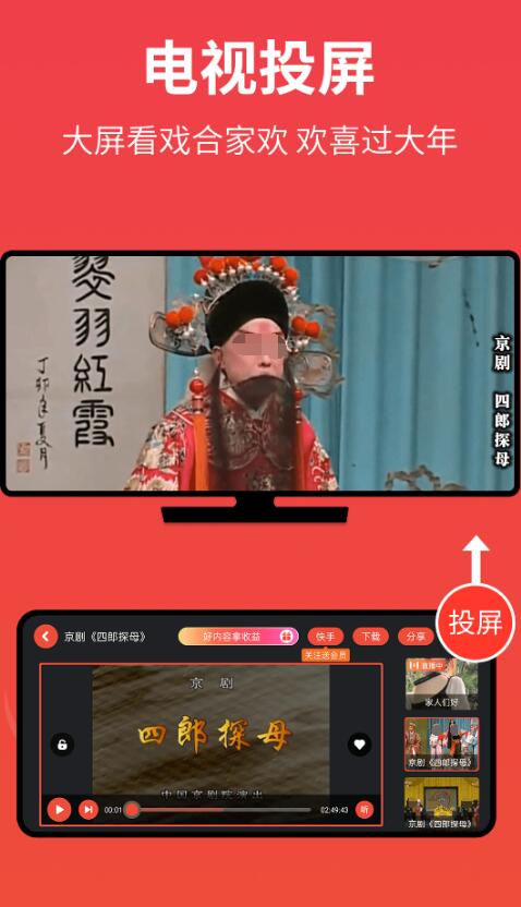 应用还带有一个投屏服务,用户可以把手机上正在看的内容放到电视上播放,收获更舒适的观看体验。此外,为了紧跟潮流,平台也新增了直播功能,大家可以快来自己喜欢的直播间互动,要是不习惯发文字,也能语音输入,内置的听戏功能,可以让完全解放每个人的手和眼,静静享受戏曲中的内容,陪伴老人度过一段美好时光。