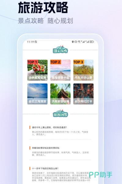 旅游应用不受时间场所限制,随时随地即可查询信息全面,内容丰富扩大旅游产业的布局。当前使用旅游app的用户越来越多,这款应用助力小伙伴们提前做好相关计划及攻略,提前做好出游的充分准备。可在线设置旅行景点以及想要打卡的地方,可记录过去打卡过的景点,记录美好时光。不仅有旅行指南,还推出了一系列实用的小功能,比如经典介绍,天气推送等。