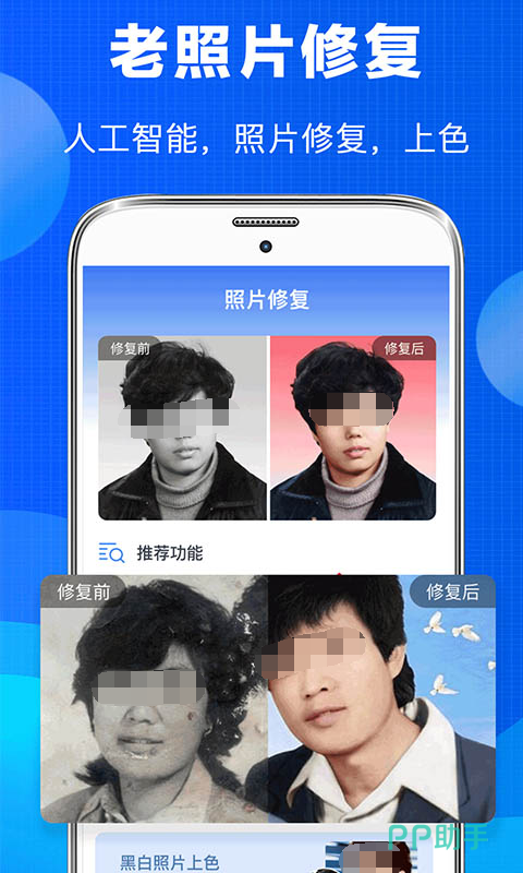 这款软件的名字虽然叫照片恢复,但是它的功能可是很多的,首先它可以将一些老照片进行修复,因为目前大多数老照片都没有电子版的存档,所以大家可以先用手机拍下来再导入到软件中,这样就可以使用软件中的一键修复或者一键换背景来对照片进行修复,这样可以让家里面的老人开心一下。