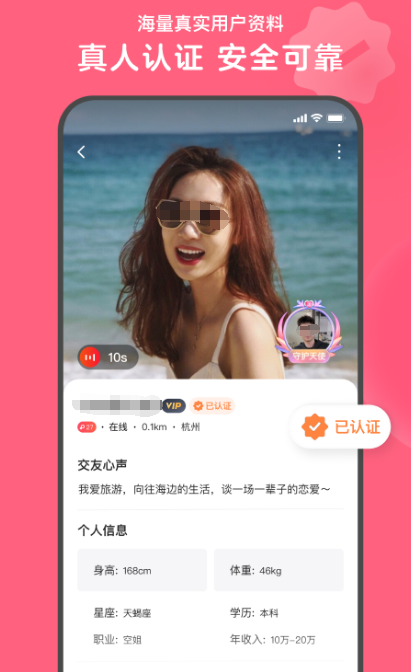如果你也正在为找不到合适的另一半而发愁,小编建议选择这款软件,这是一款专门为单身男女打造的聊天交友软件,用户均是真人身份认证,不存在虚假欺骗行为。
