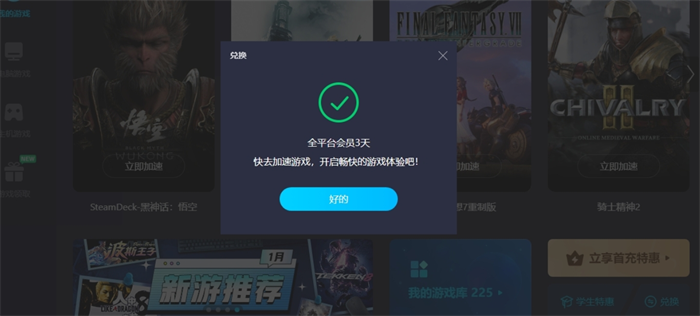 值得一提的是对于新用户平台有着24小时的加速福利给到,这让一些新用户不用考虑上来就要充值的问题,也能很好的避雷,同时在软件首页中,大家也能看到其右下角有个兑换的字样,点击一下,在里面输入口令【biubiu不卡顿】就能再得3天的加速,这个福利老用户到时候也能去领取哦。