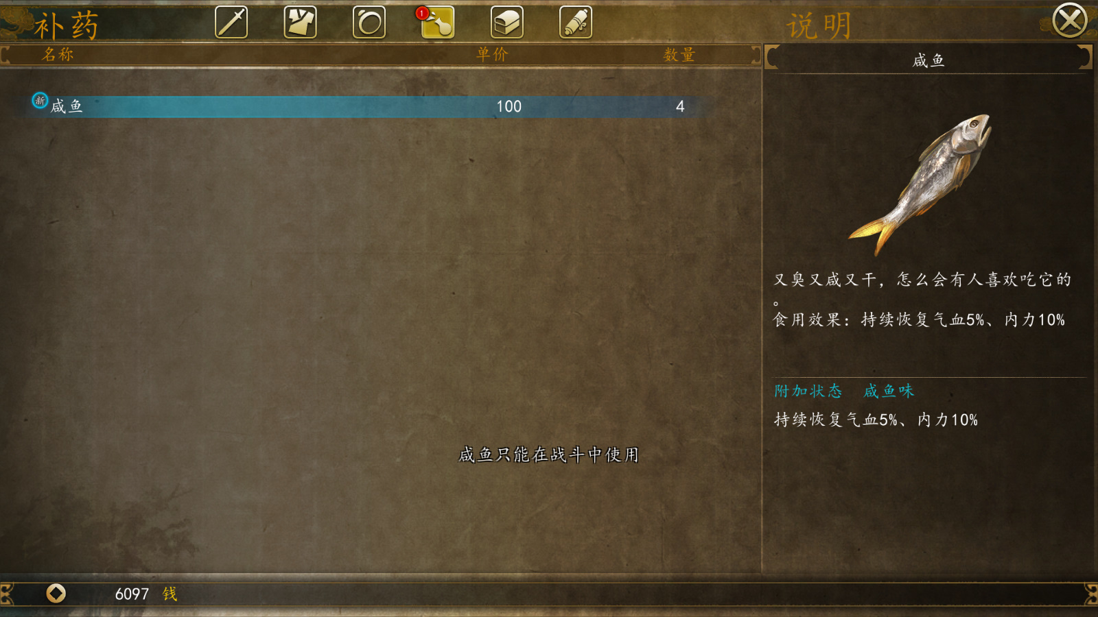 想要触发这个支线任务,玩家首先要有一双善于发现的眼睛。在老胡旁边的房间里,一筐不起眼的咸鱼静静地躺在地面上。这筐咸鱼虽然闻起来又臭又咸又干,但它却是一种神奇的食材补药。在战斗中,它能持续恢复玩家的气血5%和内力10%,可谓是战斗中的得力助手。