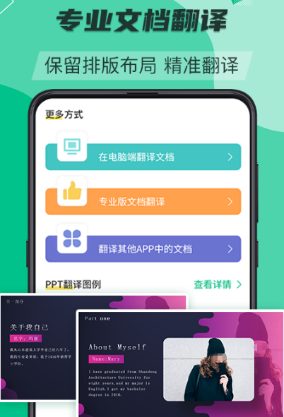 高效实用的app拥有先进的技术中英文互译真实又可靠,界面设计简洁优雅,支持多种语言,让你说走就走。有文档翻译模式,word、ppt多种文件格式全面支持。