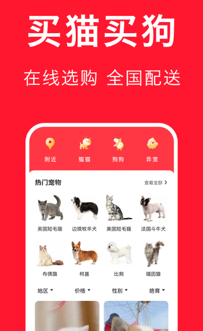 到该软件上来领养宠物,支持全国汽运配送,让你足不出户就可以买到自己喜欢的小猫小狗,上万只小宠物品质有保障,有任何问题都会一对一在线解答,通过视频可了解到各种小宠物的特性,如果喜欢就可以就把它带回家。