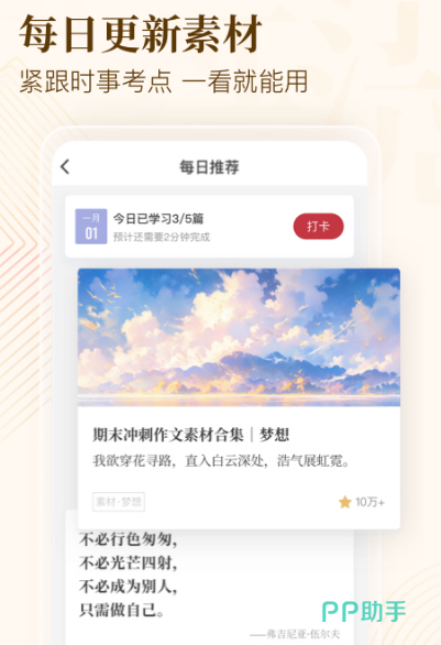 写作比较发愁,可选择这款应用无需摘抄本,一看就会每天素材都会实时更新,值机考点有好词好句经典人物,各种高分写作技法,中考高考范文都会实时推送。
