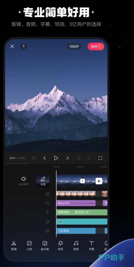 除了基本的编辑和素材功能外,这款软件还提供了多种实用功能,如绿幕抠图、画中画、音频调整等,让用户在视频制作过程中拥有更多的创意空间。