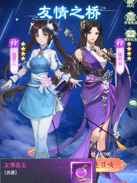 游戏中目前是有两个不同的up池的,而且这两个卡池所需要的材料都不太一样,首先就是【友情之桥】这个主要是随机召唤一些一到三星的一些伙伴,大家需要使用友情晶玉来进行抽取,没有保底的机制!