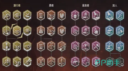 觅食者技能树提供了资源收集和生存能力的提升。游戏中资源极为重要,因此“引诱呼唤”和“草药采集者”技能是初期必备的。它们能帮助玩家更有效地收集资源和治疗。随着游戏的深入,可以解锁“寻宝”和“修补工”,以便更高效地利用战斗中获得的资源。而旅人则只要倾向于辅助能力建议最后升。