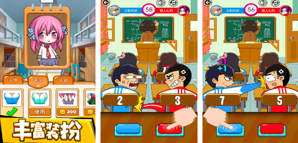 还记初中时和同桌互相恶搞的那份快乐吗?这款同桌大作战就是一款可以帮助你回忆青春岁月的小游戏作品,作为一款单机游戏,玩家在游戏当中可以分别持红蓝两个按钮,各自控制一方同学对另一方发起进攻,如果你发起的攻击越多,座椅背后的分数也会越高,也就代表着你的胜利。但需要注意的是在每一次恶搞对方的过程当中,千万不要被讲台上的老师发现。一旦被老师发现就会被叫起来罚站,这尴尬场面简直无法想象,除了基本的恶搞场景之外,在胜利之后玩家还可以按一下嘚瑟按钮,向失败者发出各种鄙视手势,想想还是非常爽的。