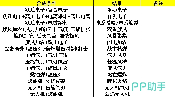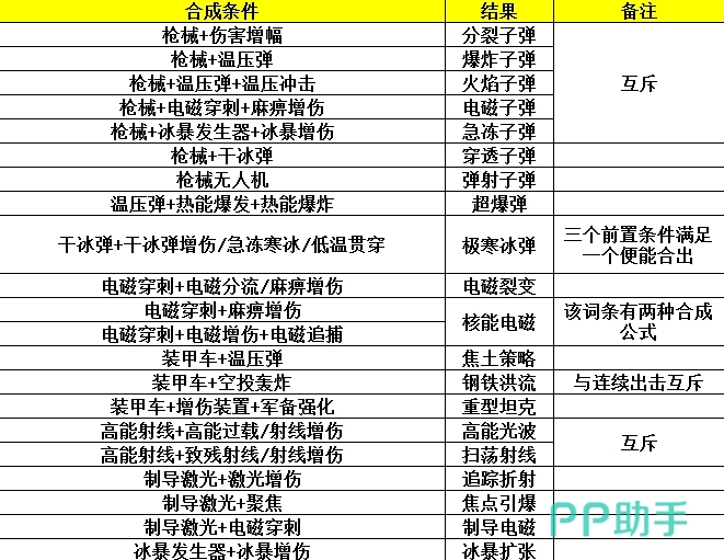 在这些公式里,有关温压弹、干冰弹和电磁穿刺类的公式都十分泛用,并且在前期就能套用公式将技能合成出来,为玩家的开荒之旅带来更多的便利,也令玩家能更为轻松、快速地闯过前期的关卡,还请玩家们加深对这类公式的印象。