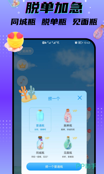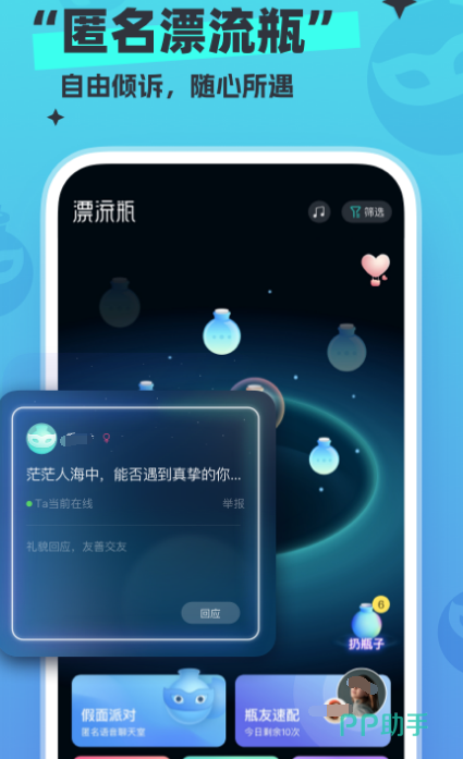与陌生人进行聊天也是非常有趣的,比如这款软件就可以通过6个瓶子寻觅知音,每天都会有2000多万个漂流瓶被捡到,自己也可将想要说的话丢进瓶子当中,提升彼此之间的感情。而且当对方捡到了自己丢的瓶子以后,相对于陌生人之间聊天来说,可避免彼此之间的尴尬以及无趣,是找对象、处cp非常好的选择。
