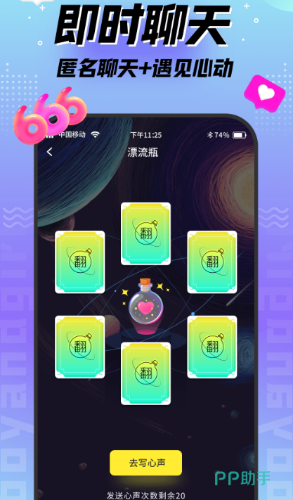 免费漂流瓶聊天不收费的app中,有很多的单身男女,在这里可畅所欲言,想说什么都可放进漂流瓶里,通过把自己的心情丢在瓶子中,可释放生活中的一些压力,还可匿名聊天,分享自己的秘密。在秘密漂流瓶当中,每天都有12个免费可以捞起的漂流瓶。可通过老起的漂流瓶,了解其他人的心事。还提供同城域偶遇、附近交友、真人交友聊天等功能。