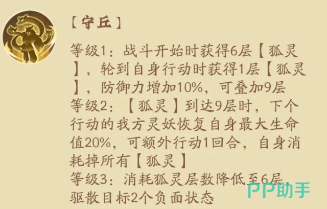 而九尾的被动效果实际上是跟他狐灵这个状态有关的,在上面九尾达到41级的时候就可以解锁守丘这个技能,在上面只要战斗到了九尾的回合就会触发这个被动,在上面从一开始战斗九尾就会获取6层的狐灵状态,大家在上面也可以在自己行动回合结束的时候拿到一层的狐灵状态,且这个时候的防御也会得到提升,虽然只有10%的提升,但是因为这个效果是可以叠加最多到9层的。