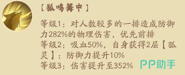 另一个主动技能则是狐鸣篝中,这个技能是在九尾21级的时候解锁的,在上面使用的时候会针对对面人数最多的横排角色,带来的数值也会达到282%的数值,虽然带来的是物理伤害但是在优先伤害级上面会优先伤害对面的前排,而在九尾达到了101级的时候,这个技能的效果还会额外带来50%的吸血效果,且这个时候的九尾在上面也会获取狐灵的效果达到两层,在九尾181级的时候大家在上面就可以看到一个伤害提升的效果,而且在最高的数值上面是可以得到350%左右提升的哦。