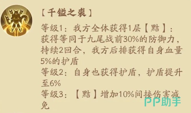 这个防御的效果是一样会持续两个回合的哦。在九尾81级的时候在上面就会让自己获取的护盾效果会提升6%的效果,而在九尾161级的时候则会利用黠的效果带来更好的防御,在上面会额外带来10%的伤害减免效果。