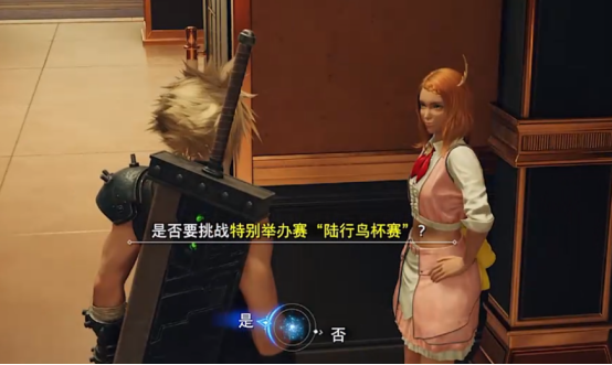 之后,我们就会骑着陆行鸟进行比赛,艾丝特会问我们是否装备好挑战特别举办赛“陆行鸟杯赛”,如果我们准备好了就点击是,然后会进入给陆行鸟的装饰界面。装饰物会提升一定的能力值。