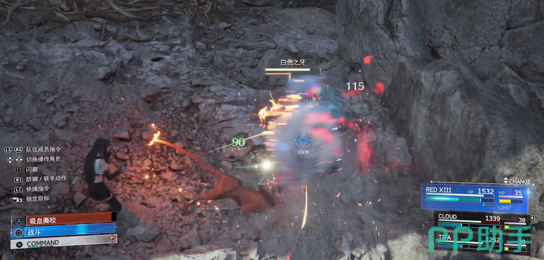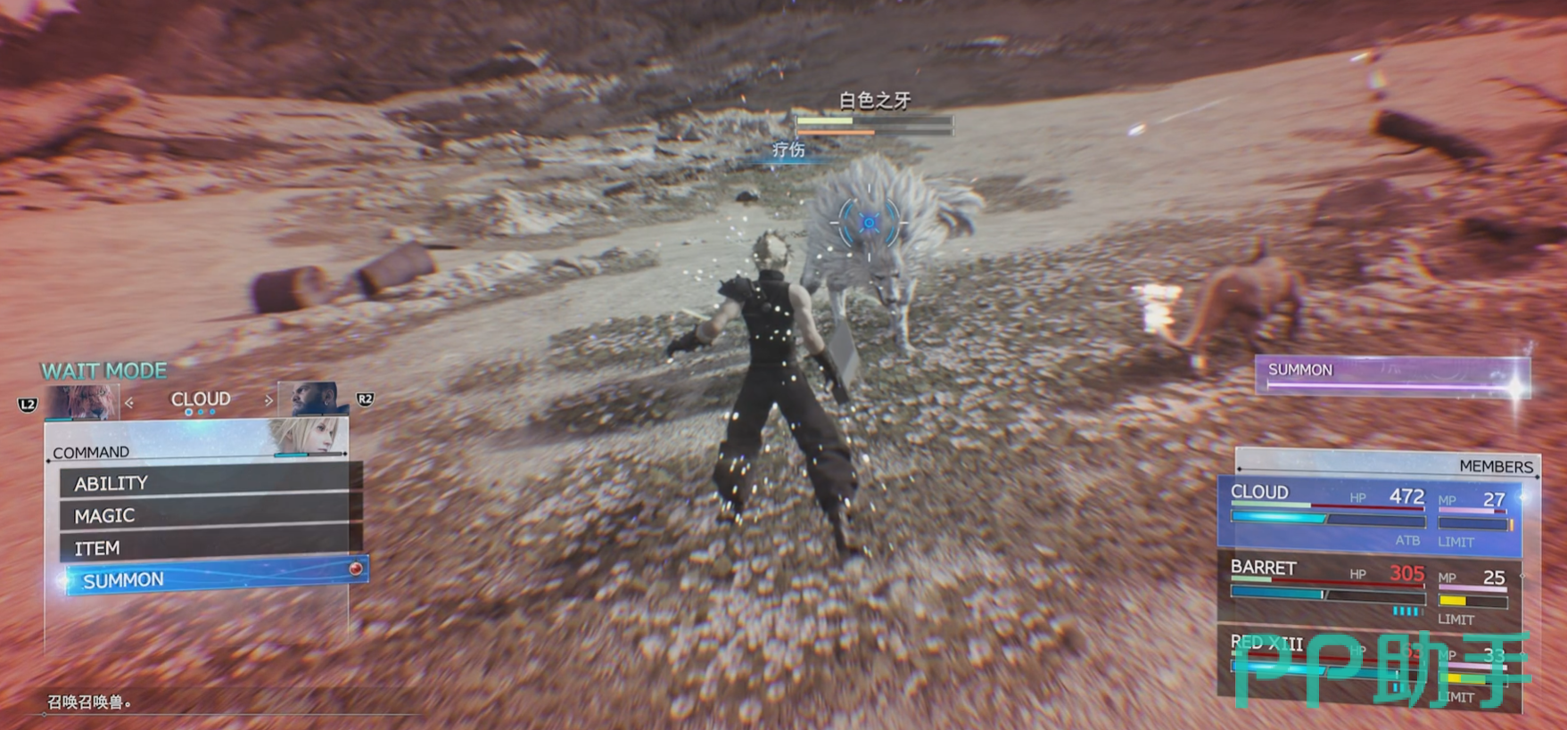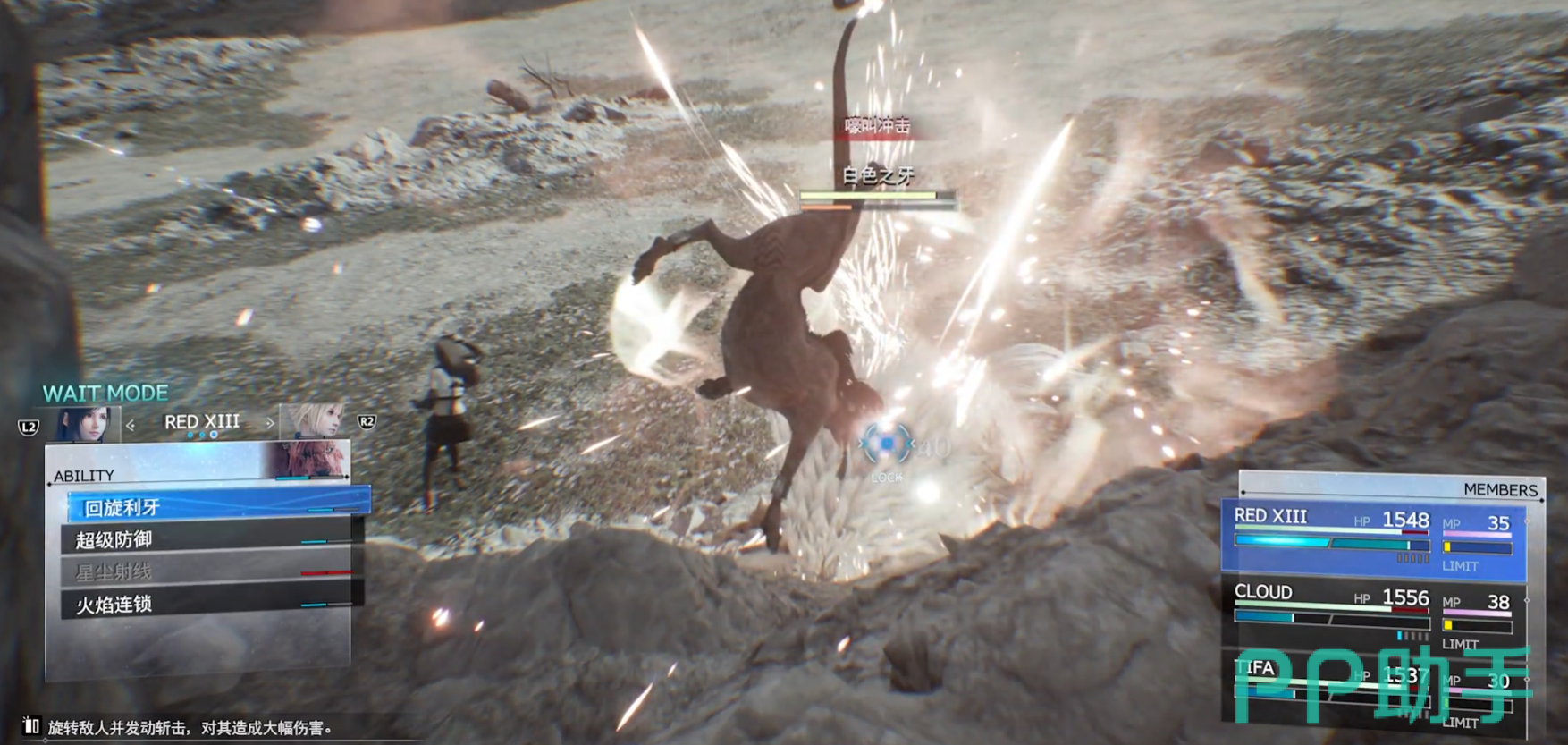 而在战斗环节中首先集中攻击白色之牙的能量护盾,高护盾高护盾回复这是他最为棘手的一个特色。可以控制克劳德使用气卦技能,不断攻击以耗尽敌人的护盾。一旦护盾被破坏,白色之牙就很好打了。这时可以使用秘技进行高输出攻击。白色之牙会使用包括强力的物理攻击和魔法技能。所以对我们的走位也有一定的要求,也要注意利用角色的特殊技能和召唤兽来对白色之牙造成有效的打击。