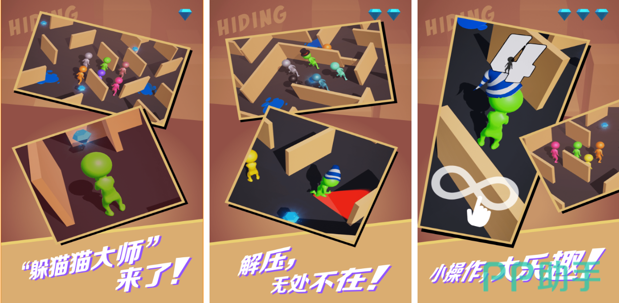 躲猫猫大侠是款玩法比较经典的3D躲避类硬核游戏,玩家将扮演躲藏者在房间各个角落中寻找隐藏地点,在规定时间里没有被抓捕者NPC找到就可以获胜,3D立体的游戏场景和花花绿绿的角色造型很有辨识度,简单的操作方式也给玩家带来了更大的乐趣,紧张爽快的躲避过程也让躲猫猫的粉丝趋之若鹜,你有信心躲避抓捕者NPC的搜查吗?