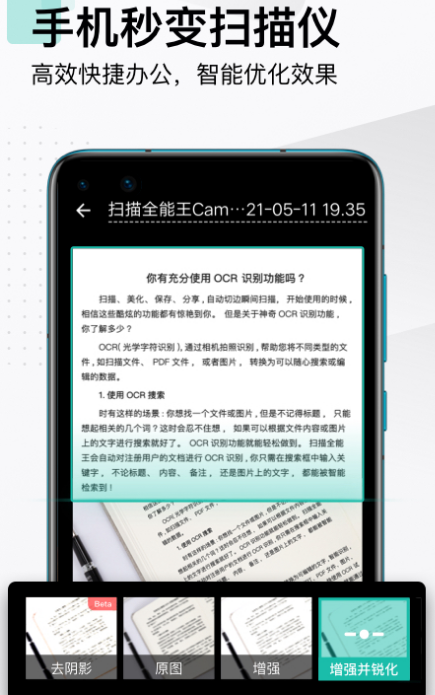 当需要扫描的时候家里并没有扫描仪,就可利用该手机充当智能扫描仪,集文件扫描图片,文字提取识别等功能为一体验,也是全球智能扫描引领者。通过自动扫描以后可生成高清扫描件,还支持很多格式的保存,或者是将扫描件转成自己需要的文档格式,比如ppt,Excel 、word等,也支持电脑,平板、手机等多设备同步查看。
