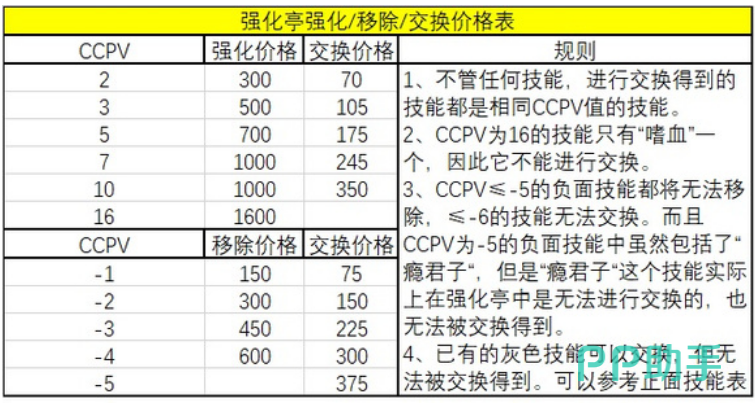 在强化亭中,技能交换是一项重要功能。玩家可以通过消耗一定的点数来交换技能,例如“嗜血”技能就需要16点数。正确的交换策略可以让你在战斗中获得巨大优势。选择的时候评估你当前的技能组合和战斗需求,然后选择那些能够补充你弱点或增强你优势的技能进行交换。而且交换出的技能应该与当局的战斗风格和任务目标相匹配是最高性价比的使用方法,而负面技能方面,可交换、删除技能如下表: