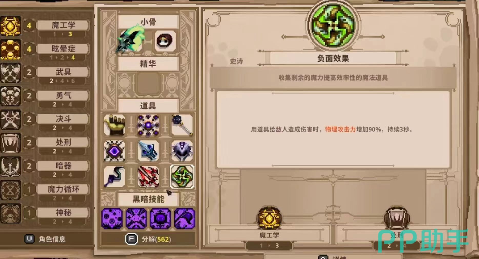 有一些强力装备的攻击效果更是优秀,橄榄树棍拥有很优秀的属性,能够提供二十点的增幅,对头骨和大多数道具能够起到针对性伤害,面对铁手套等道具时也是从容不迫的。无形剑带有十五点的基础伤害和百分之十的暴击率,能从中获得巨大的效益。战士钢锤的基础伤害就能达到四十,再加上卓越刻印和毁灭之手,它就可以完成物理眩晕的效果。魔剑与火药剑这两个是道具中的的主力,魔剑基础伤害很高,火药剑则是拥有高暴击的伤害和灵动的基础伤害。在战斗中起到一定的引领作用。