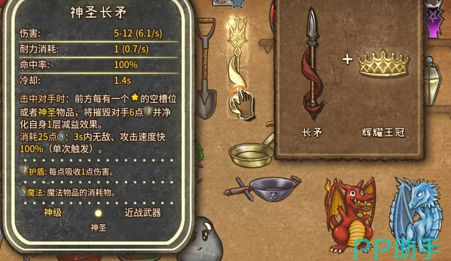 想要得到它需要玩家用长矛以及辉耀王冠合成。首先重要的就是长矛了,本身属性就不错, 王冠属于可以提升强化,资金充足可以先买,不充足就放到后面。