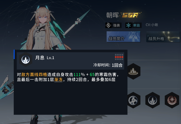 【朝晖】是一个寒霜属性的职业,作为强袭选手,小编也是在实战中体验过了,强度是非常ok的,作战过程中,朝晖可以触发【勇状】效果,来给自身提升一个勇敢属性,让自身受到的伤害降低4%!当自身的生命值高于60%的时候,是会直接获得一层勇状效果的!这就意味着,作为一名强袭类的职业,在游戏中依靠这个效果也是可以打出非常出色的伤害的!释放【月息】的时候,是可以以四个格子的范围,对多个敌人造成伤害的,并且最后一次攻击还会让敌人受到一个渐动效果!