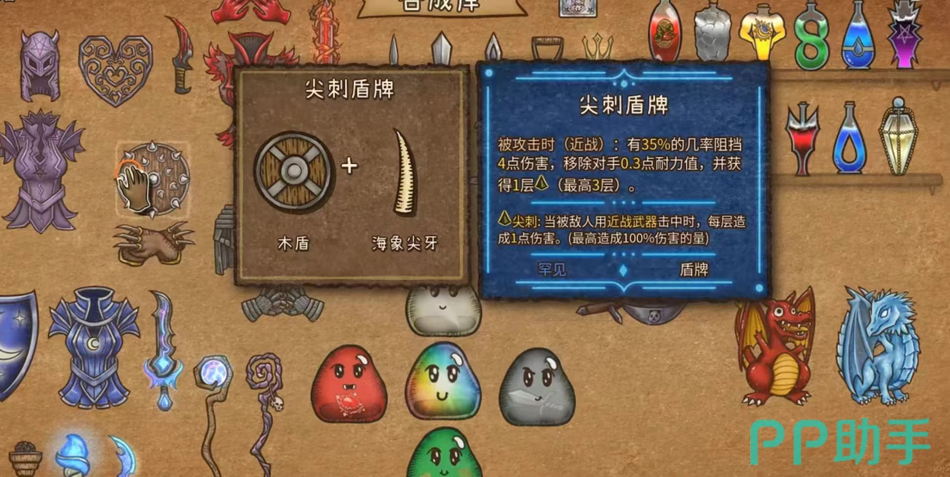 尖刺盾牌是木盾和海象尖牙合成,它是一种罕见类型的盾牌,结合了圆形盾和尖刺防御的设计,在战斗中起到防御效果的同时增加了反击效果,使用灵活,在战斗中可以获得优势。