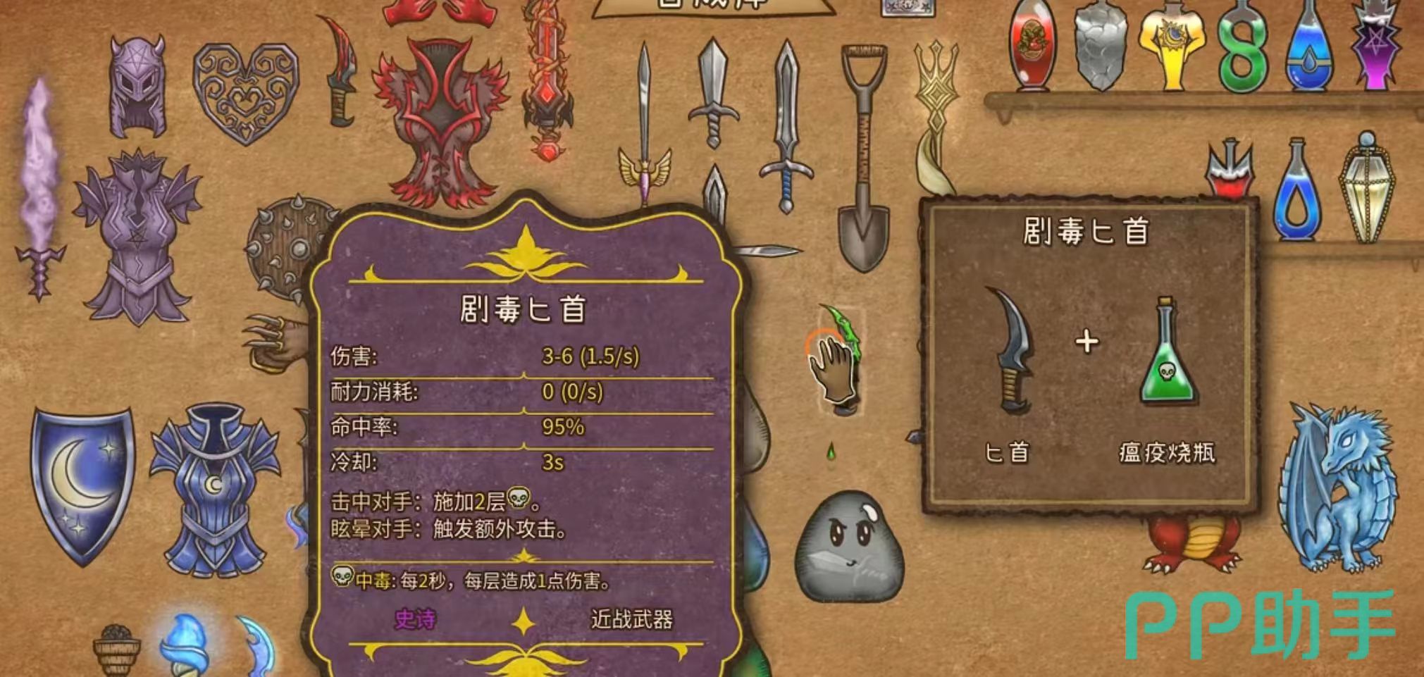 剧毒匕首是匕首和瘟疫烧瓶合成的,也可以用一个黏黏与两个致幻蘑菇合成,当玩家有五个星级物品激活时,剧毒匕首在净化二层中毒效果时同时可以施加给对手四层的中毒效果,这把武器适用于特定的战斗对局中。