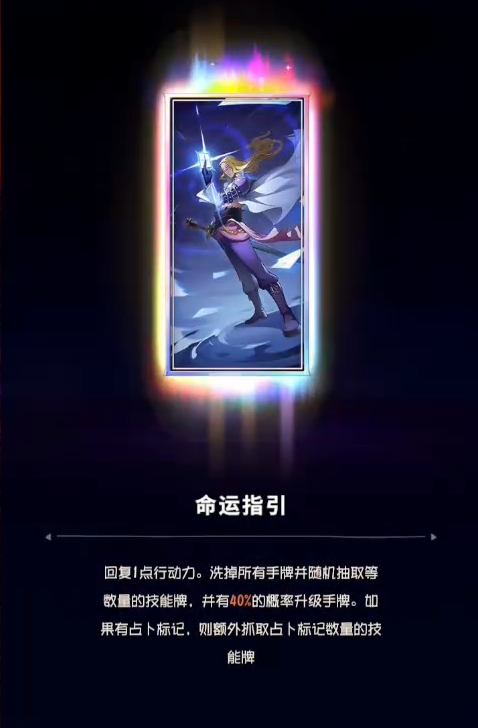 霍金斯——技能【命运占卜】是他为数不多的伤害技能,属于单体伤害。使用技能【命运裁决】可以选择一名队友然后抽取该角色的技能卡,并且有概率可以额外再抽到一张卡牌。技能【命运指引】可以增加队友技能效果和增伤。奥义技能可以一定程度的拉条并且重新抽取卡牌手中等同数量的技能卡。