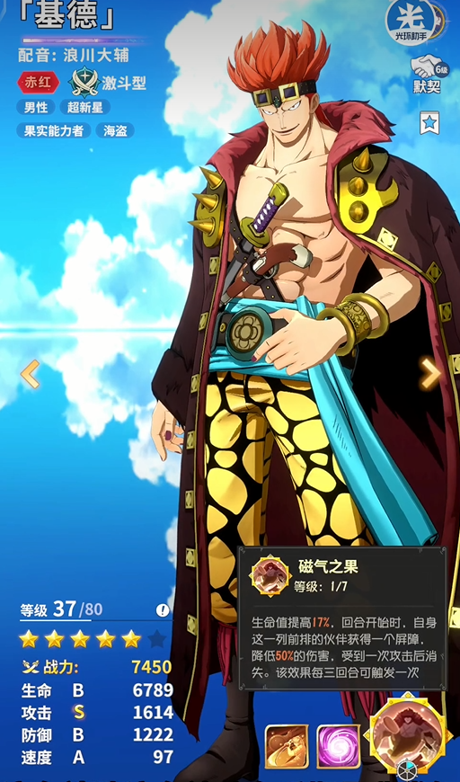 基德——技能【磁气之果】可以给前排队友套盾,这个盾可以维持三个回合。技能【磁气巨臂】主要是单体伤害,该伤害与基德自身的血量值有关。【磁气囚结】可以偷取敌方单位的奥义技能,并且给自己套盾可持续两个回合。奥义技能是基德的核心,可以给敌人造成大量的伤害,还能让敌人无法换位。