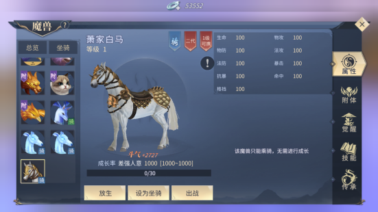 另外,坐骑类不可以跟随玩家进行战斗。系统第一个赠送的魔兽萧家白马就是坐骑类,坐骑那魔兽只能起到骑行和观赏作用,此外,个别战斗型魔兽也是可以骑的。