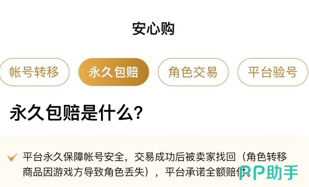 交易的所有流程交给客服处理就好,买卖双方只需要确定相关信息内容并配合客服操作就可以了。期间买家有要求的话会进行一次官方验号操作,待买家确人没有任何问题之后才能够发货。部分商品都带有安心购保险服务,拥有该项保险的商品是可以享有永久包赔权限的。