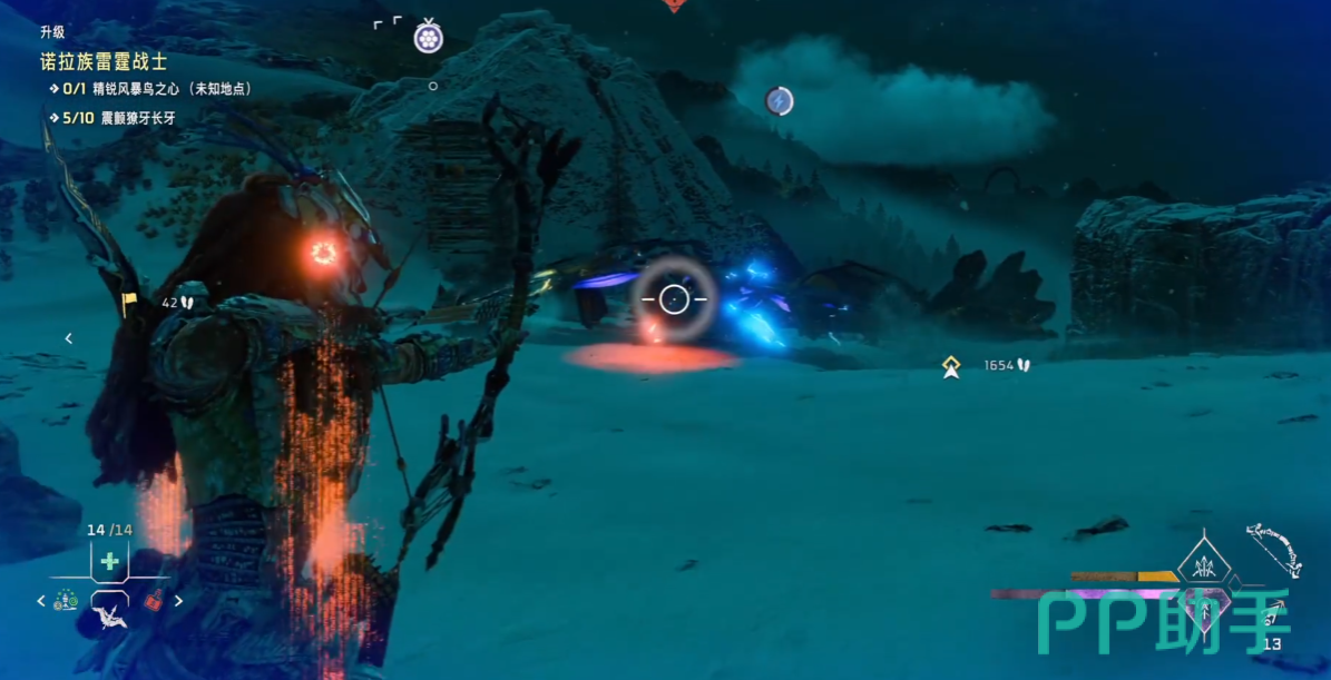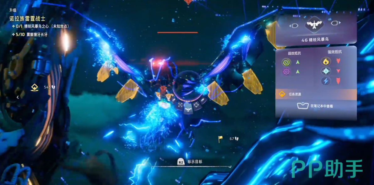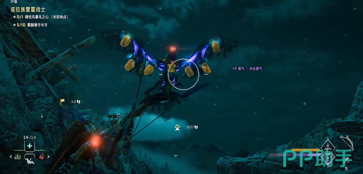 然后我们就可以准备战斗。风暴鸟对电击和冰冻箭矢特别敏感。使用这些元素类型的武器可以有效地削弱它们的战斗能力。而且风暴鸟的弱点大家可以先扫描出来,其实就是它们的胸部和尾部的引擎,精准的箭矢攻击可以造成额外伤害。如果感觉难以攻克的话,还可以开启辅助瞄准。风暴鸟会发动突袭和空中轰炸,因此不断变换位置,利用地形遮挡可以增加生存率。利用绳索发射器将风暴鸟拖到地面,这样可以限制它们的移动,为我们提供更多输出伤害的机会。