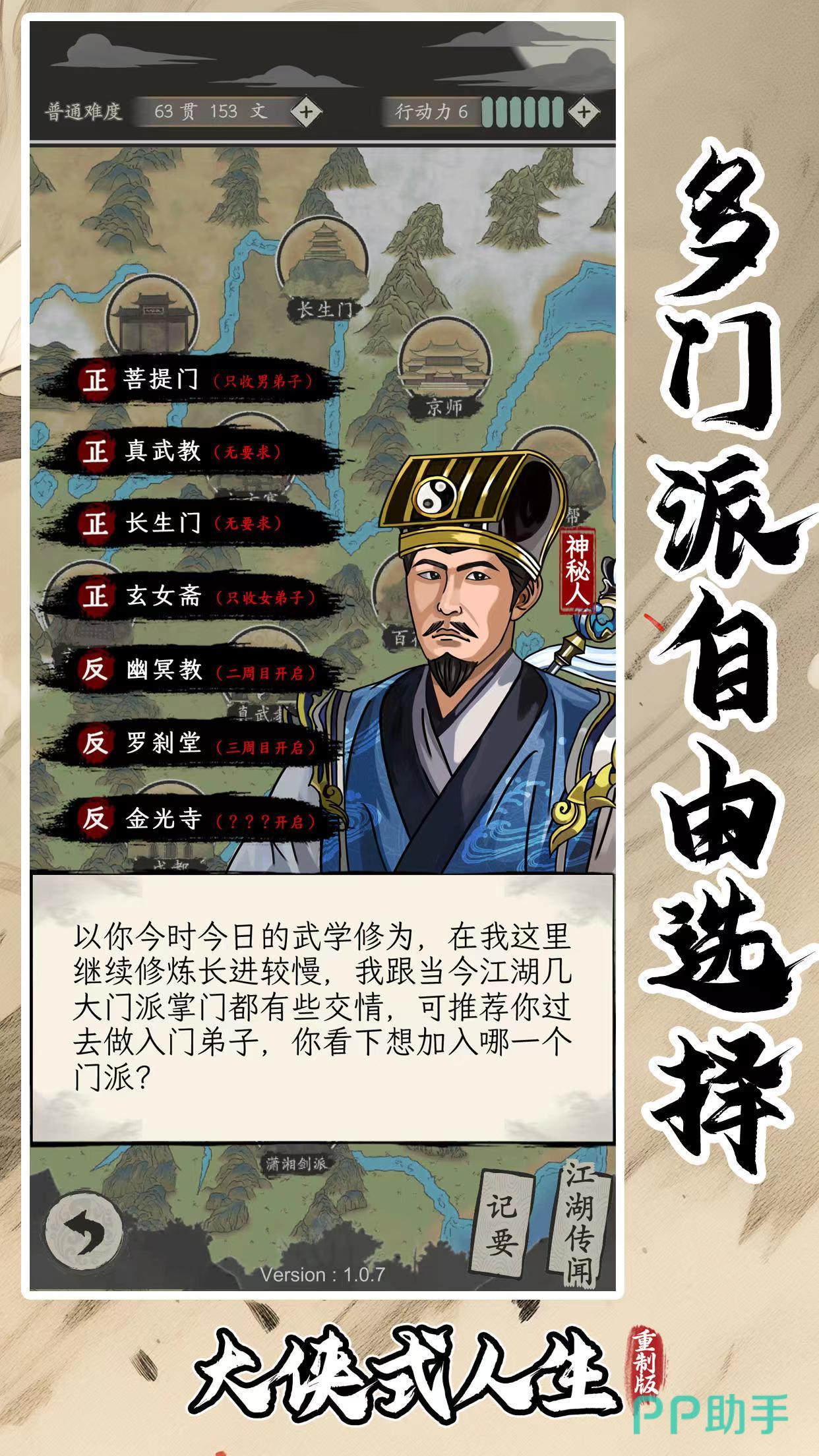 多种不同的剧情是游戏非常吸引大家的地方,除了丰富主线之外,还会根据玩家每一次所选择的选项,进行随机性剧情事件生成,这样整个江湖生活将会变得更加有趣,在自己完整的寿命之内,玩到的内容都是独一无二的。游戏里有各大门派等待大家加入,江湖中有众多门派值得挑选,加入之后都可以在这里面学习到独特武学,如果加入的是正派或是反派,还有各自专属的剧情体验。