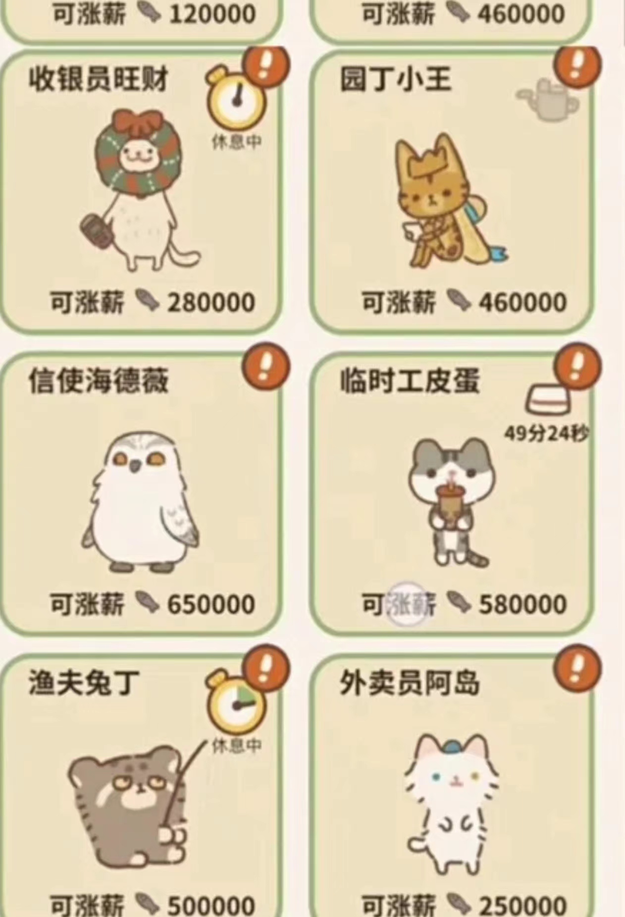 好了,看完了满级员工一览表,接下来小编就教一下大家,该如何升级和怎么选择员工的升级顺序吧。如果你比较佛系,那么小编建议的员工升级顺序是临时工皮蛋,客服喵小厨,渔夫兔丁,外卖员阿岛,外卖员阿花。