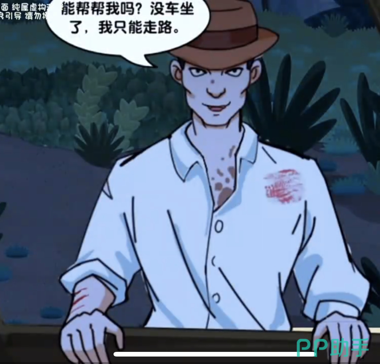 玩家开局就会进入一个行驶在黑夜中的小路上,在行驶的过程中,你会碰上第1个男人,他嘴角带着诡异的笑容,衣服上有血迹,胸口有胎记,手臂上还有伤,而且他说的话和他自己所讲述的内容是不同的,所以不同意他上车。
