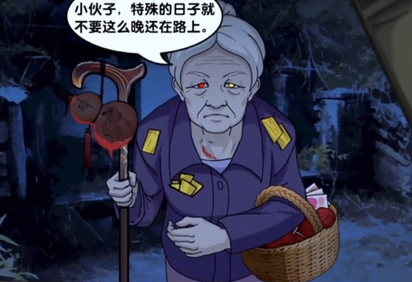 第4个也是遇到的最后一个人,是一名老太太,老太太的两个眼瞳是不一样的,而且身上带有各种各样的符咒,脖子上有伤口,手上拿着个拐杖,拐杖的上面还挂着一个葫芦仿佛被什么浸泡过,手里有一个跨栏,跨栏里面也装了一些红色的物体,但是玩家需要同意他上车。