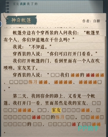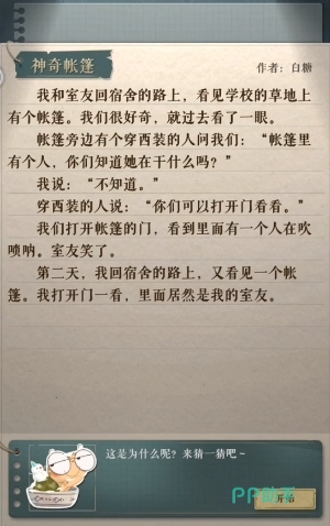 这个神奇帐篷关卡当中讲述的故事其实是很简短的,在上面大家可以提取出来几个关键词,首先是帐篷,这是贯穿整个故事的重点,其次就是喇叭,因为故事当中舍友好奇的是帐篷当中的人为什么在吹喇叭,这里还有一个角色是穿西装的人其实是一个干扰项。