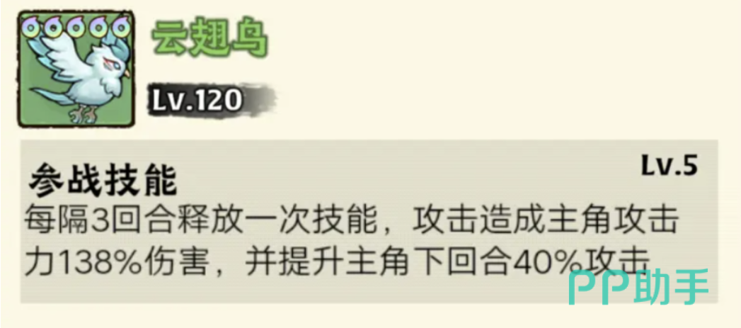 每三个回合就能释放一次技能,与其他灵兽的伤害倍率它略微显得逊色了些,但是云翅鸟的辅助力十分的出色,当释放完技能之后是可以提升主角下一回合攻击四攻击力,对玩家爆发伤害帮助特别大,而且这只灵兽的获取难度不是那么高,大部分玩家都倾向于选它。