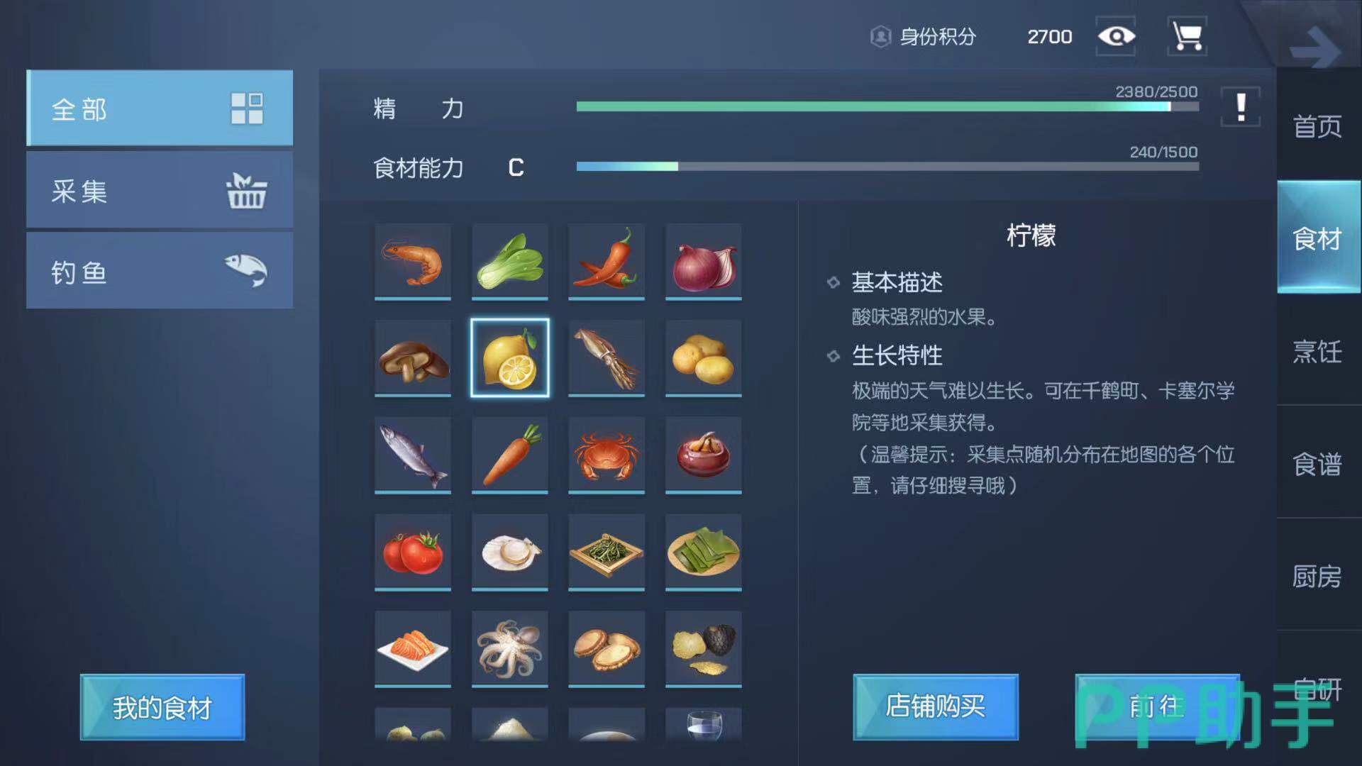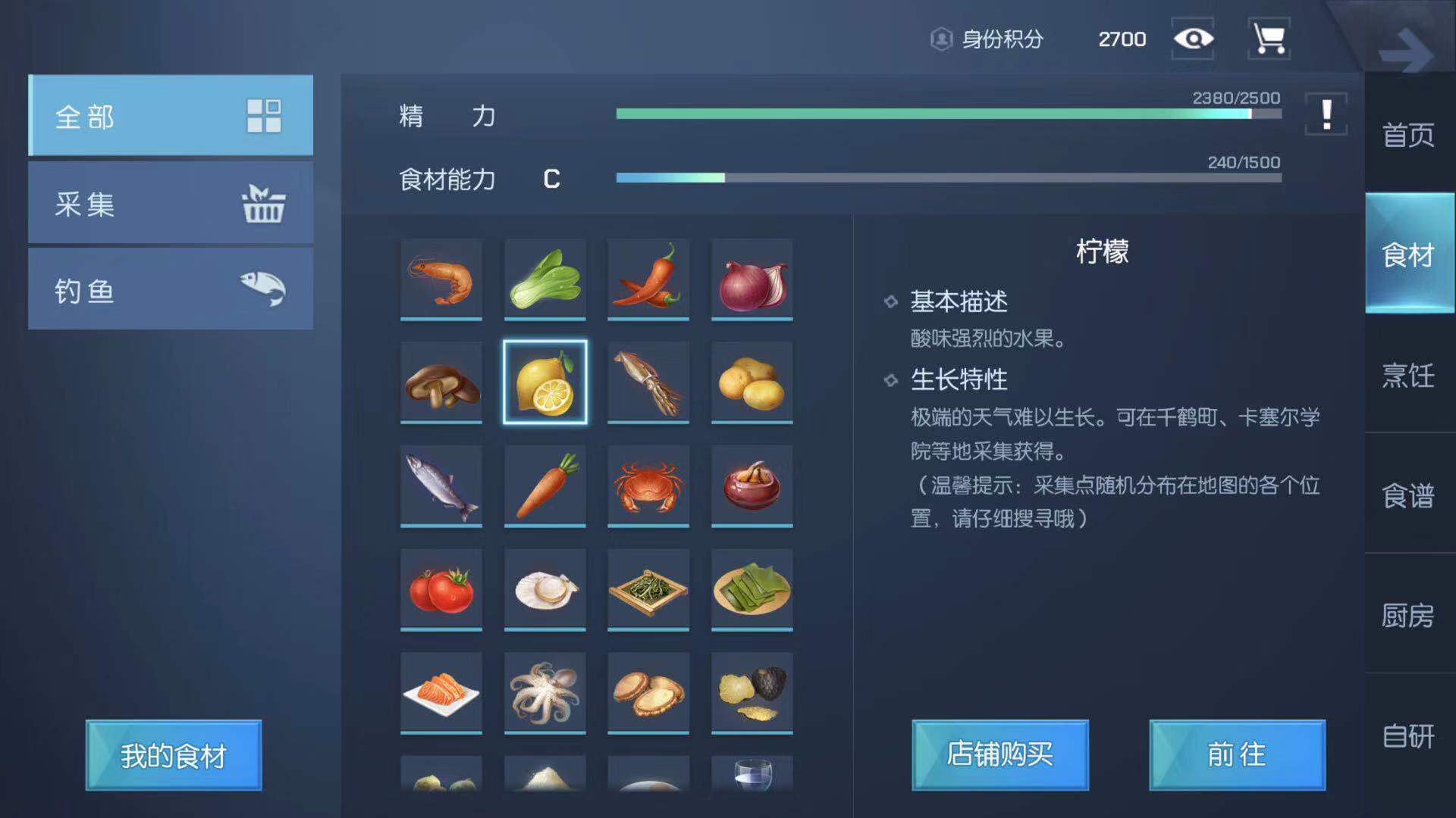 食材熟练度的提升:来到食材界面可以看到很多的食材,我们这里不管选择任何一种食材都会有点麻烦,因为食材的采集一般采集个5次左右就会消失,又要重新选择采集的地方,所以我们就选择一个柠檬吧。