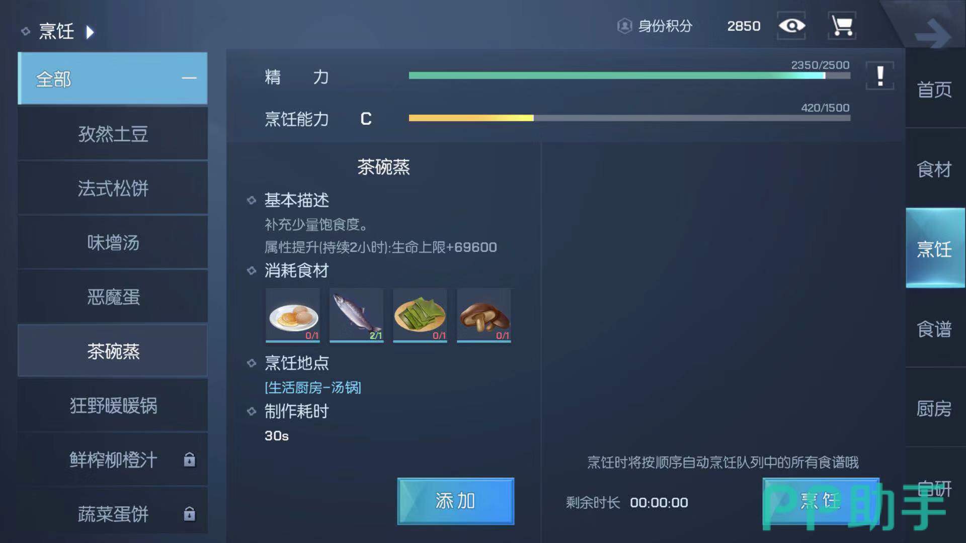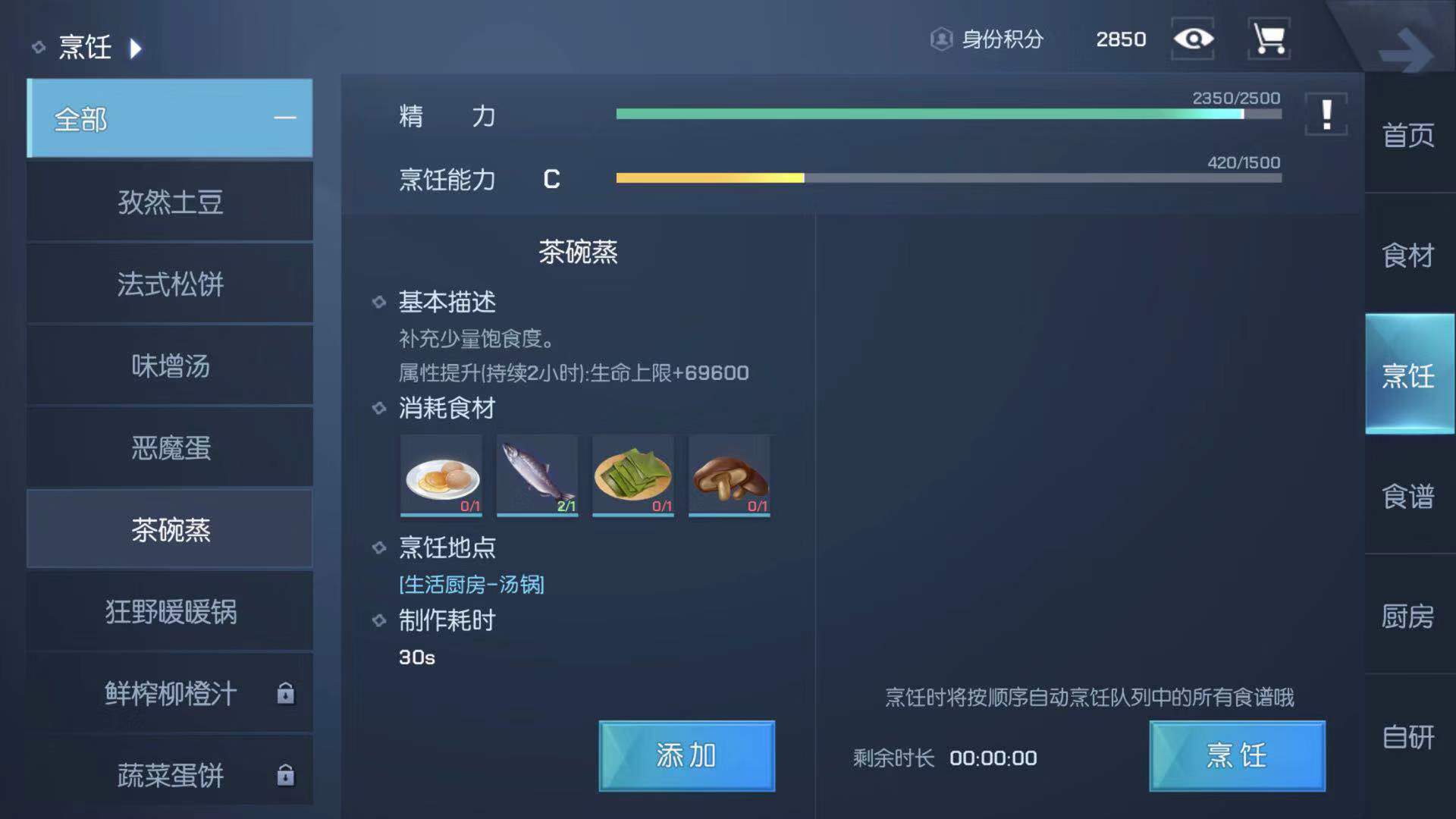 烹饪熟练度的提升:这个比较简单了,首先我们要确定一个想要制作的料理,比如茶碗蒸,需要的食材有豆腐、鸡蛋、蘑菇、野生鱼,那么就去蛇岐八家的食材商人处将这些食材都购买30份,然后点击烹饪。