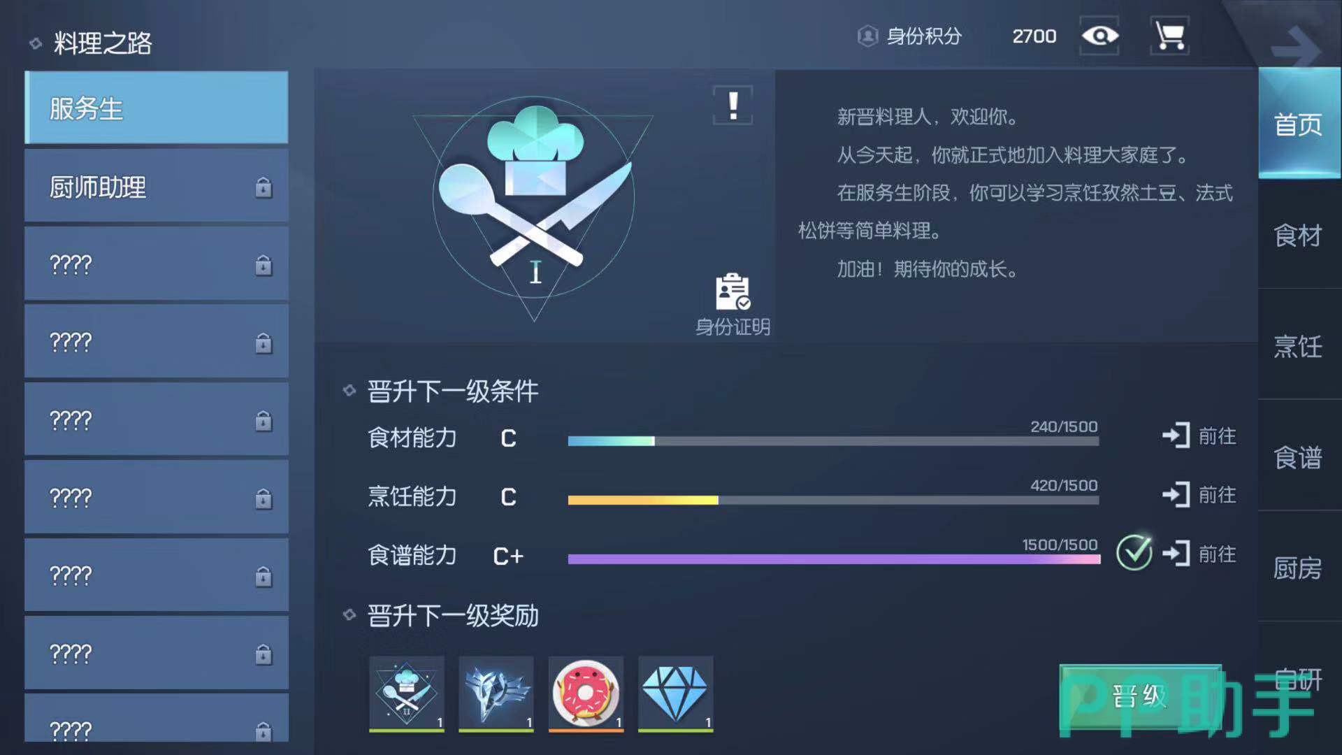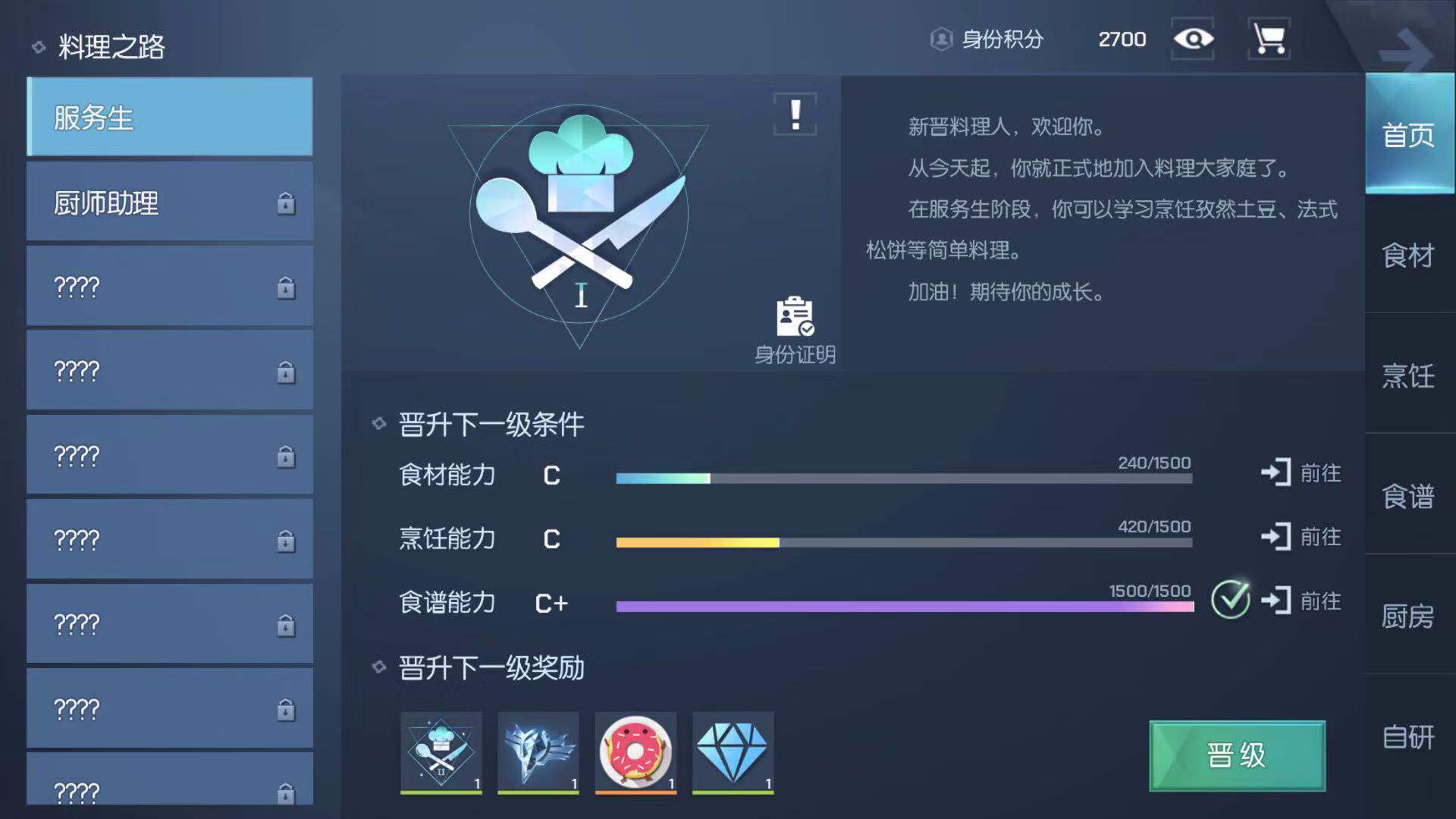 厨师的晋级之路:厨师的晋级主要是完成食材、烹饪、食谱三种能力的熟练度,每升一级需要的熟练度也就越高,小编目前在最低级的厨师身份,需要三种能力熟练度达到1500就可以晋级了。