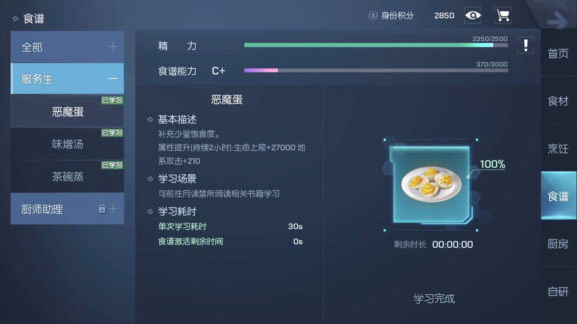 系统让我们自动回到厨房,每30秒会完成一份料理,完成之后获得大量的经验和30点的烹饪熟练度,慢慢来一直提升到1500点即可。